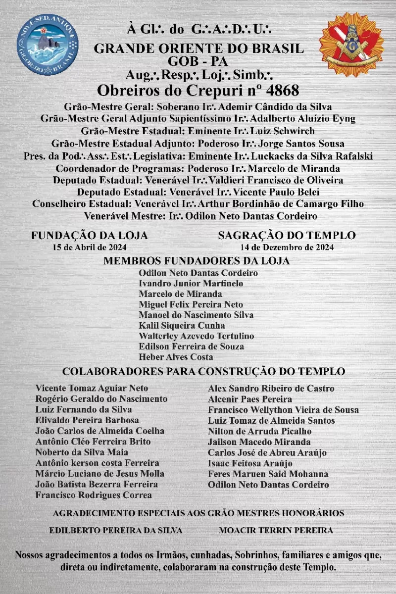 Este dia especial reafirma o compromisso do GOB-PA com o fortalecimento da Ordem e a preservação de seus valores. A sagração do templo, a entrada de novos membros e a fundação de mais uma Loja representam a continuidade das tradições de fraternidade, ética e aprimoramento humano que guiam a Maçonaria.